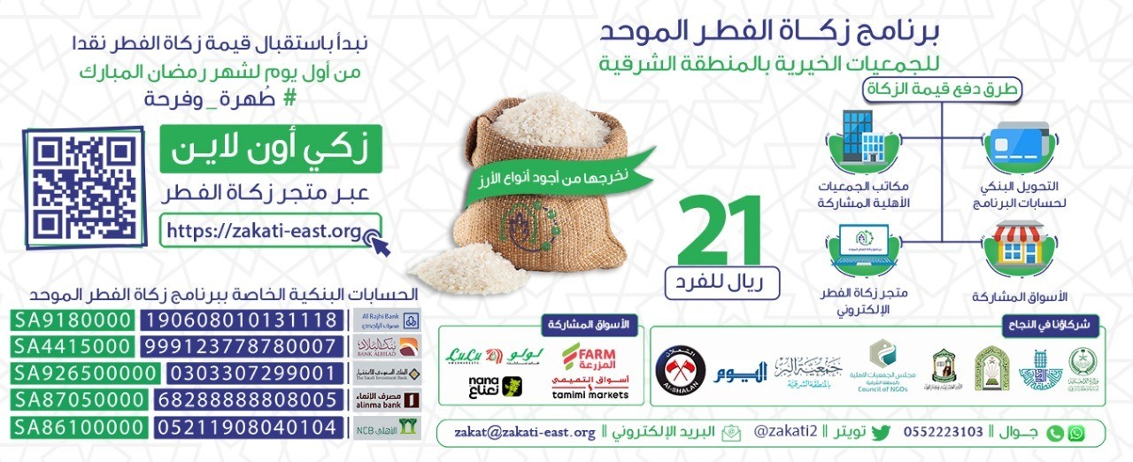 كشف المتحدث الإعلامي  لبرنامج زكاة الفطر الموحد بالمنطقة الشرقية فيصل بن مقبل المسند أن هناك 136 مركزا تجاريا بالمنطقة الشرقية من بينهم 35 جمعية خيرية بالمنطقة تعمل لاستلام وتوزيع زكاة الفطر بالشرقية وقال المسند أن البرنامج بدأ في استقبال زكاة فطر المزكين بدءا من أول رمضان بقيمة 21  ريالا للفطرة الواحدة وأنه سيتم صرفها لمستحقيها في وقتها الشرعي، موضحا أن برنامج زكاة الفطر الموحد الذي تشارك به 35 جمعية من جمعيات المنطقة الشرقية للعام السابع على التوالي جاء بتوجيه من صاحب السمو الملكي أمير المنطقة الشرقية الأمير سعود بن نايف وسمو نائبه لتوحيد جهود جمعيات المنطقة في استلام وتوزيع الزكاة والتغلب على التحديات التي تواجه زكاة الفطر بالمنطقة كالحد من الزحام وقت استلام وتسليم الزكاة أمام الجمعيات وغيرها والحد من ازدواجية صرف الزكاة والحد من العشوائية في التوزيع و الحرص على إيصال الزكاة لمستحقيها والحد من مشاكل النقل اللوجستية المتعلقة بالزكاة، قائلا أن  البرنامج راعى أن تكون الزكاة من قوت البلد المحدد وهو "الأرز" كما يتبع البرنامج أيضًا آلية منظمة لضمان إيصال زكاة الفطر لمن يستحق، حيث يستند برنامج زكاة الفطر الموحد في توزيع الزكاة على قاعدة بيانات للفقراء والمساكين تم بنائها وفقًا لدراسات وبحوث من الجمعيات الخيرية لهذه الحالات، داعيا المزيد من الجمعيات الخيرية بالشرقية للانضمام لزكاة الفطر الموحد لتكون الزكاة وفقا لآلية موحدة أكثر تنظيما.