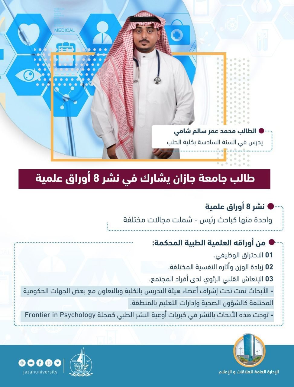 شارك الطالب بالسنة السادسة بكلية الطب بجامعة جازان محمد عمر سالم شامي في نشر ٨ أوراق علمية - واحدة منها كباحث رئيس- في مختلف المجلات العلمية الطبية المحكمة.