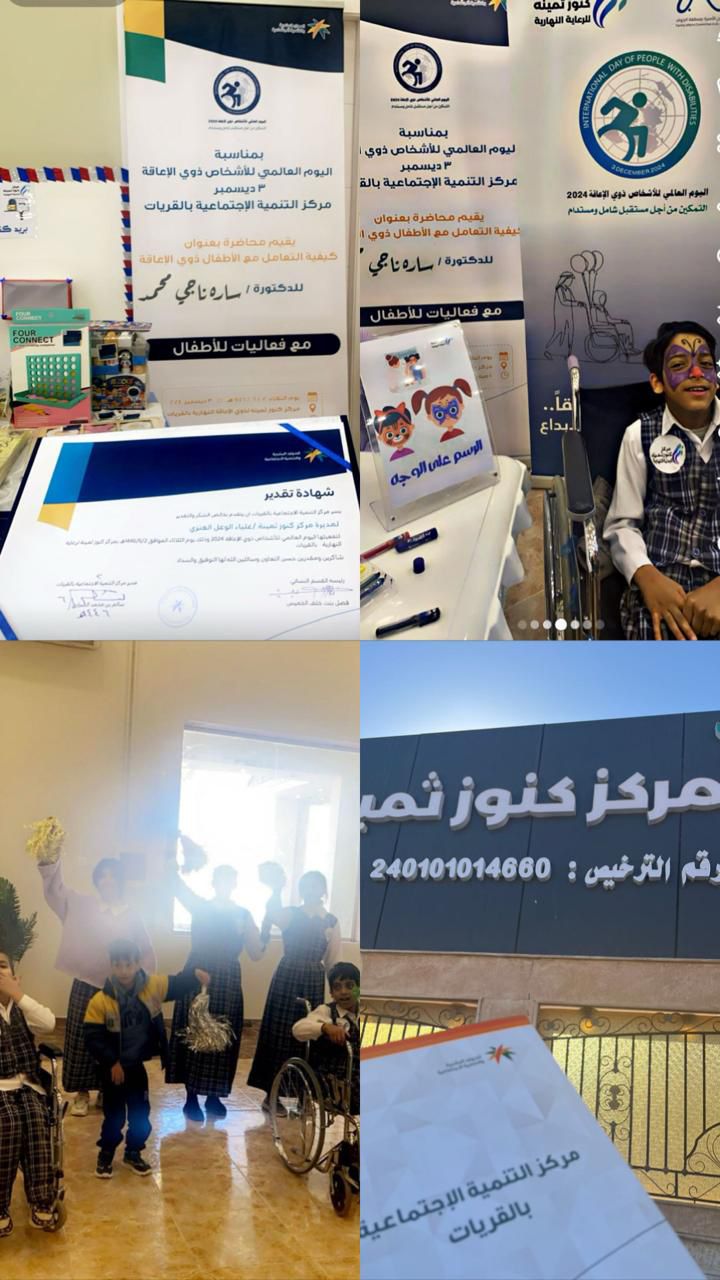 تزامنًا مع انطلاق فعاليات اليوم الدولي للأشخاص ذوي الإعاقة ، أقام مركز التنمية الاجتماعية بالقريات محاضرة بعنوان "كيفية التعامل مع الأطفال ذوي الإعاقة" بالشراكة مع مركز كنوز ثمينة للرعاية النهارية بالمنطقة. قدمتها الدكتورة سارة ناجي والتي سلطت من خلالها الضوء على مفهوم ذوي الإعاقة سواء كانت الإعاقة سمعية أو بصرية أو حركية أو عقلية ، كما أوضحت كيفية التعامل معهم من قبل الأسرة ، وأهمية العلاج الطبيعي والإرشاد النفسي ، فيما بينت أهمية الاندماج مع المجتمع ، كما استعرضت خلال المحاضرة بعض الشخصيات الملهمة من ذوي الإعاقة مثل : المخترع إديسون ، والمؤلف السعودي سلطان العذل .. وغيرهم .