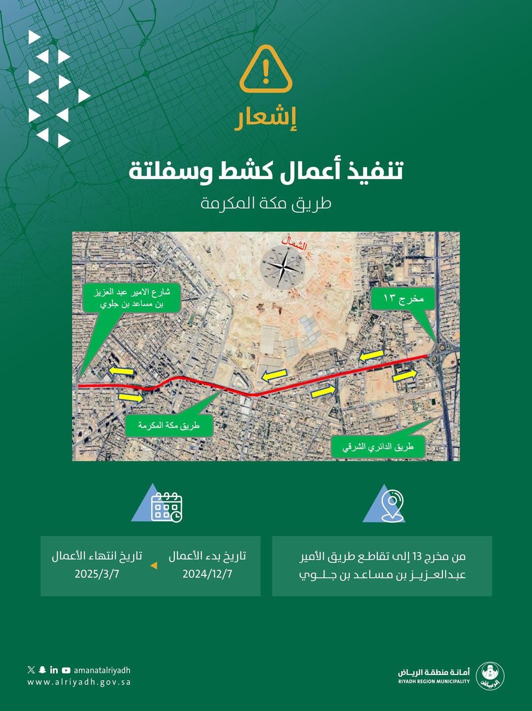 تعزيزًا لجودة الطرق.. أمانة الرياض تبدأ أعمال كشط وإعادة سفلتة طريق مكة المكرمة