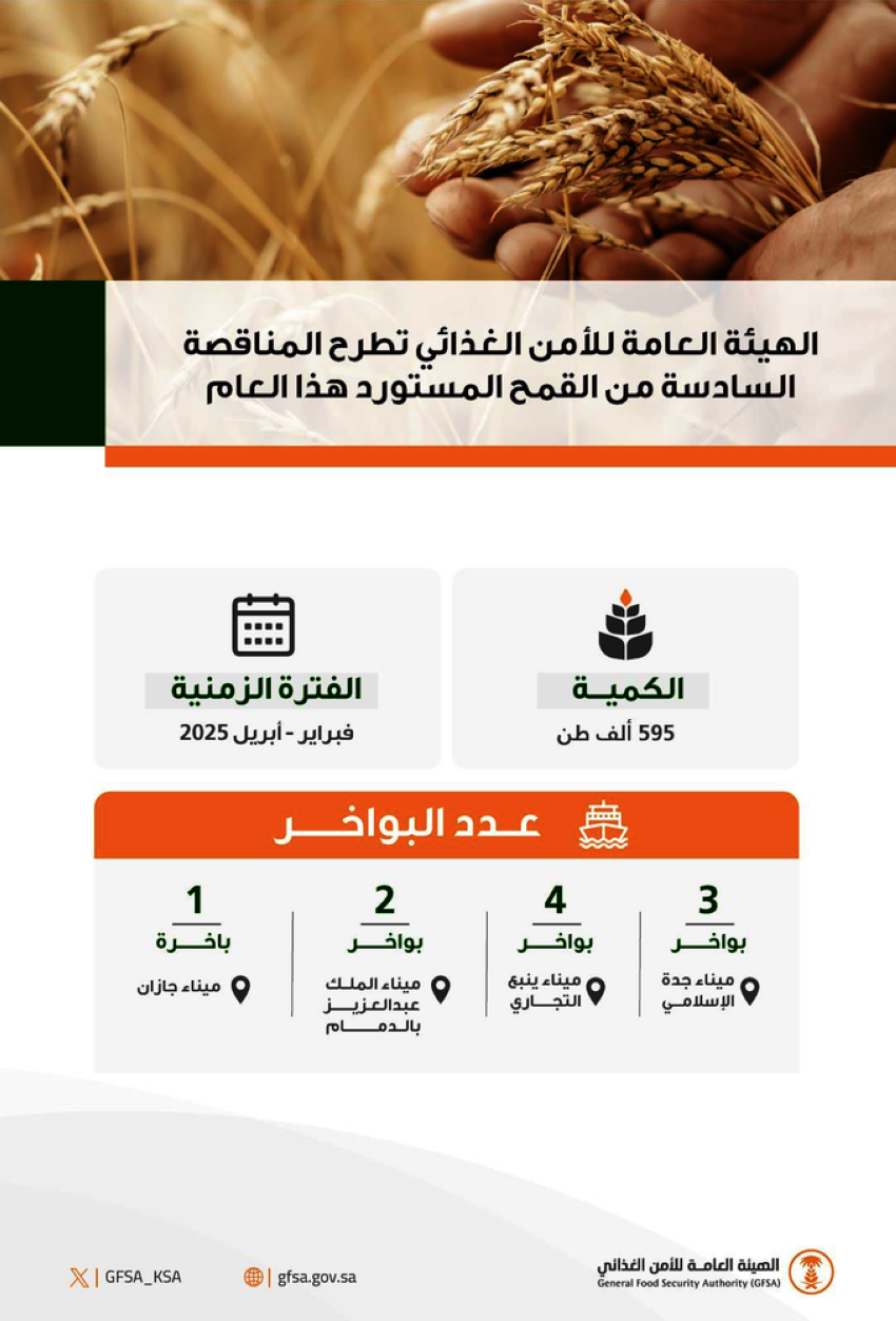 أعلنت الهيئة العامة للأمن الغذائي، اليوم، عن طرح المناقصة السادسة لاستيراد القمح لهذا العام، وذلك لكمية (595) ألف طن للتوريد خلال الفترة (فبراير ــ أبريل 2025م).