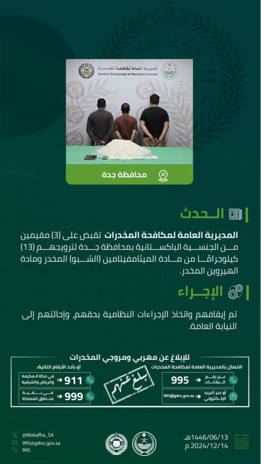 مكافحة المخدرات تقبض على 3 مقيمين بجدة لترويجهم 13 كيلوجرامًا من مادة (الشبو) المخدر