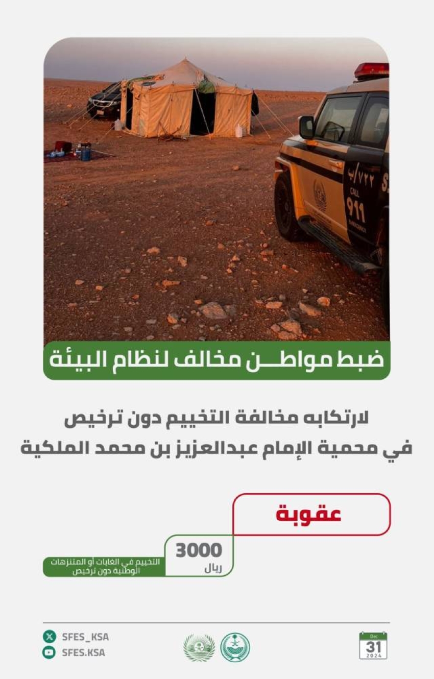 وأوضحت القوات أن عقوبة مخالفة التخييم في الغابات أو المتنزهات الوطنية دون ترخيص غرامة تصل إلى (3,000) ريال، حاثةً على الإبلاغ عن أي حالات تمثل اعتداءً على البيئة أو الحياة الفطرية على الرقم (911) بمناطق مكة المكرمة والرياض والشرقية، و(999) و(996) في بقية مناطق المملكة.