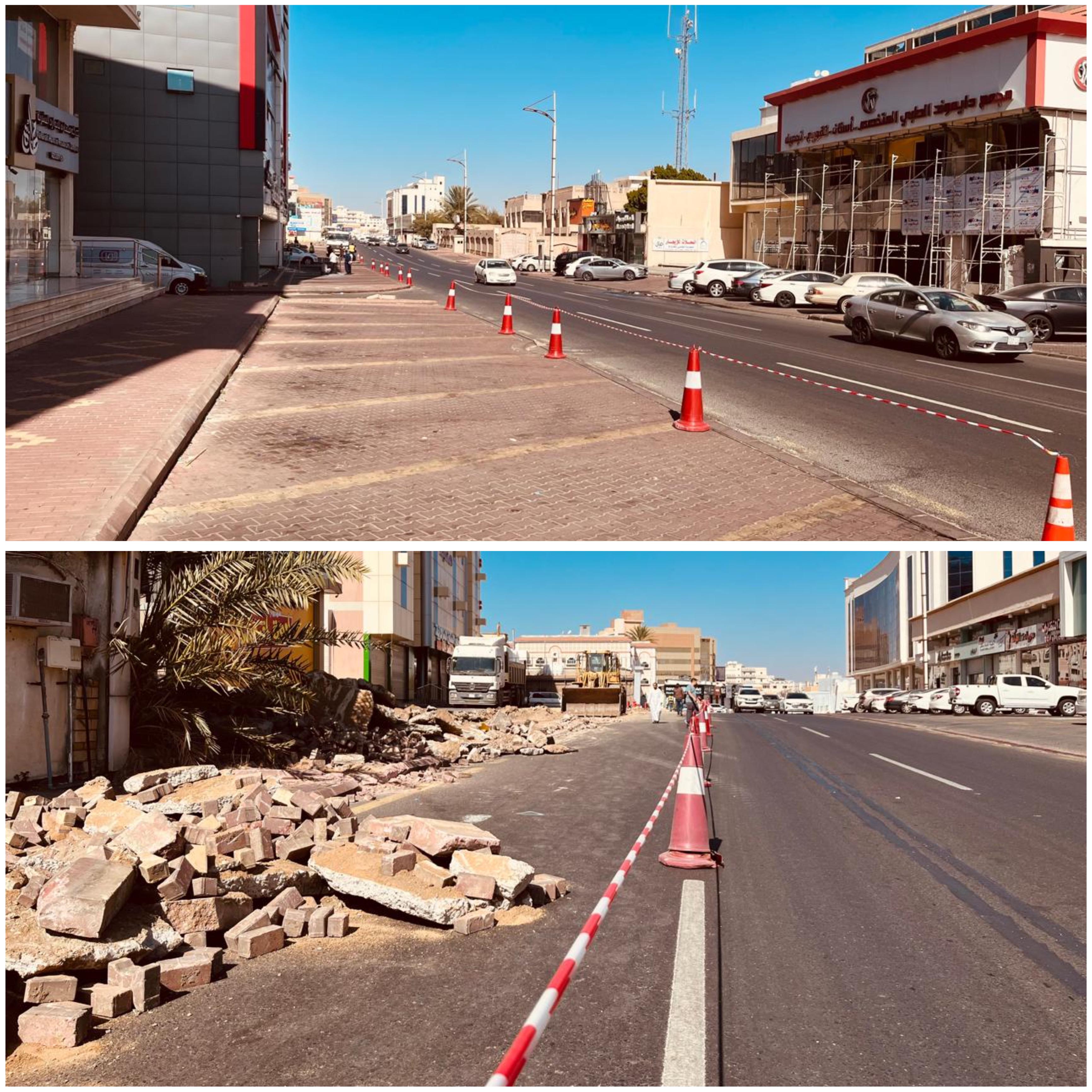 وشرعت الآليات في تعديل مواقف السيارات الجانبية بما يحقق عدم عرقلة حركة المركبات المتجهة إل طريق الشفا.