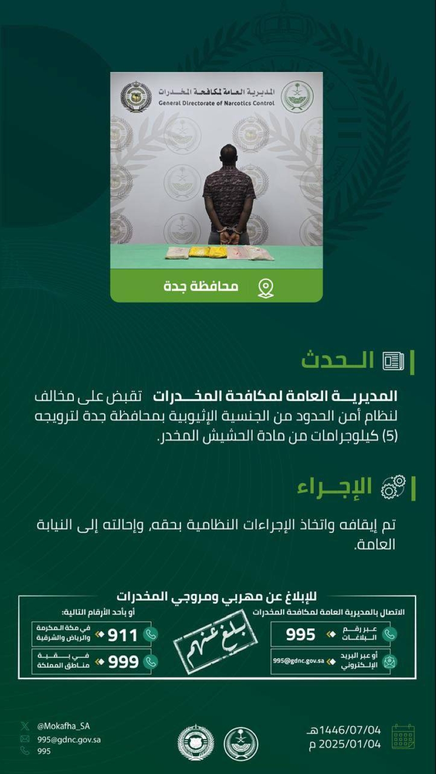 قبضت المديرية العامة لمكافحة المخدرات على مخالف لنظام أمن الحدود من الجنسية الإثيوبية بمحافظة جدة لترويجه (5) كيلوجرامات من مادة الحشيش المخدر، وجرى إيقافه واتخاذ الإجراءات النظامية بحقه، وإحالته إلى النيابة العامة.