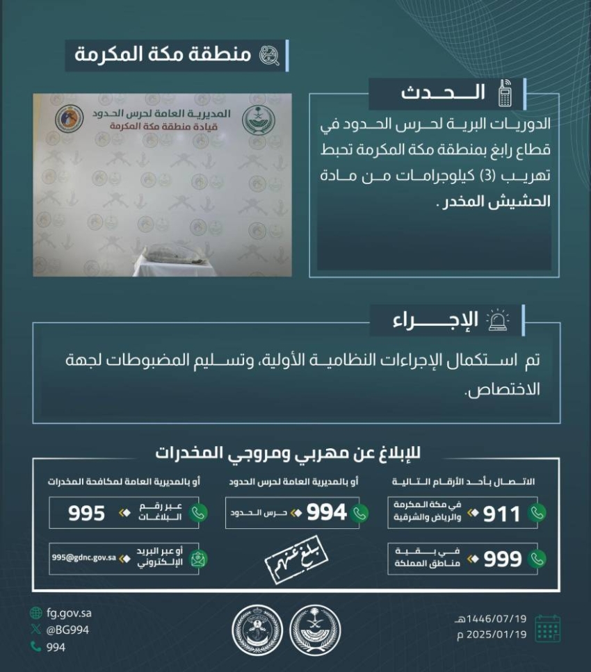 أحبطت الدوريات البرية لحرس الحدود في قطاع رابغ بمنطقة مكة المكرمة تهريب (3) كيلوجرامات من مادة الحشيش المخدر، وجرى استكمال الإجراءات النظامية الأولية، وتسليم المضبوطات لجهة الاختصاص.