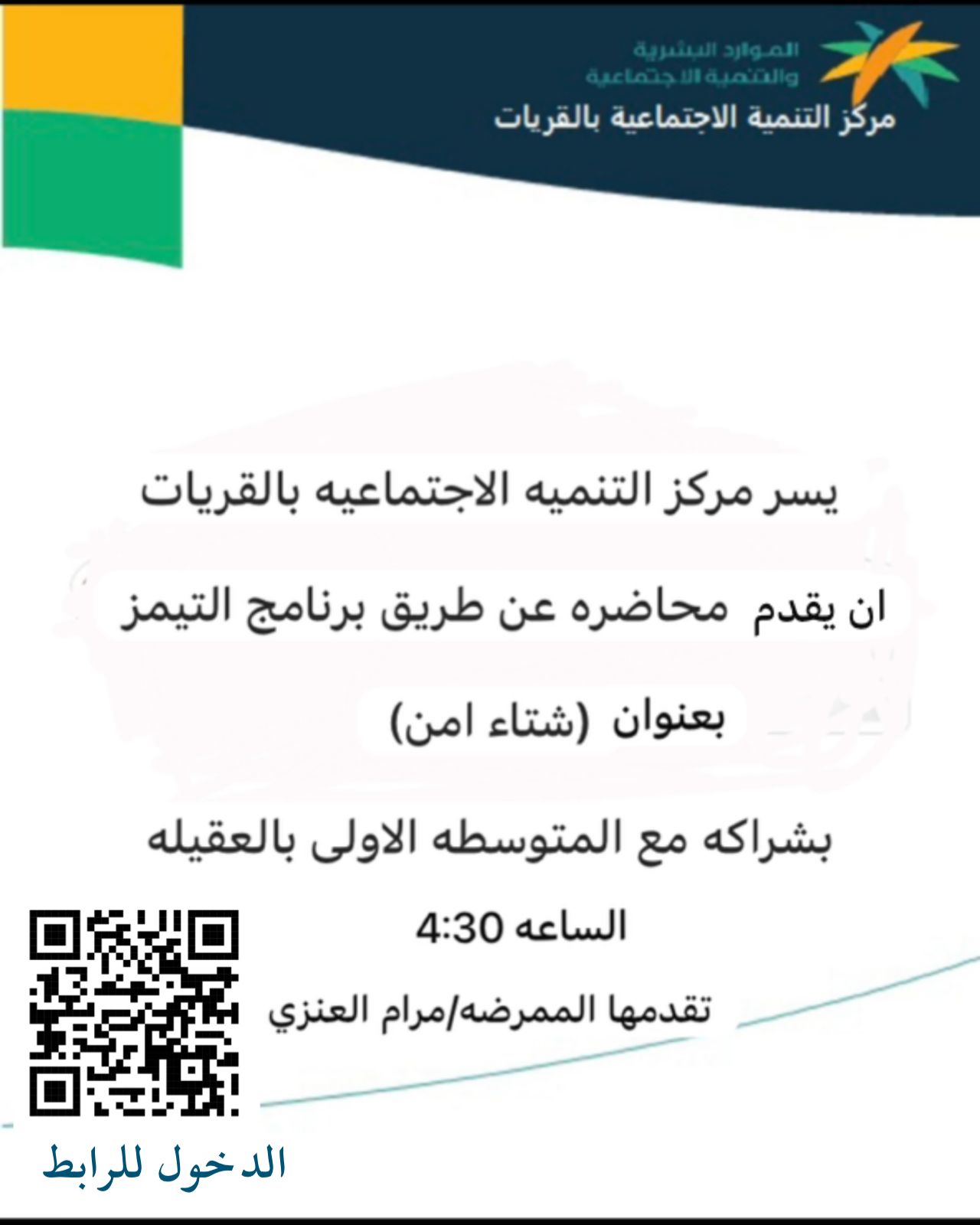 ضمن برامج وأنشطة المجتمع المحلي ، فعل مركز التنمية الاجتماعية بالقريات محاضرة توعوية بعنوان ( شتاء آمن ) عبر برنامج التيمز وذلك بالتعاون مع المتوسطة الأولى بالعقيلة ، قدمتها الممرضة مرام فرحان العنزي من إدارة الأزمات والكوارث حيث تطرقت فيها عن نصائح لشتاء صحي آمن ، و الإنفلونزا الموسمية والوقاية منها ، وضرورة أخذ اللقاح للحد من انتشار العدوى ، وأهمية فتح النوافذ في أماكن التدفئة ، والابتعاد عن الفحم والحطب في مكان مغلق ، وأهمية تناول الفيتامينات التي تقوي جهاز المناعة .