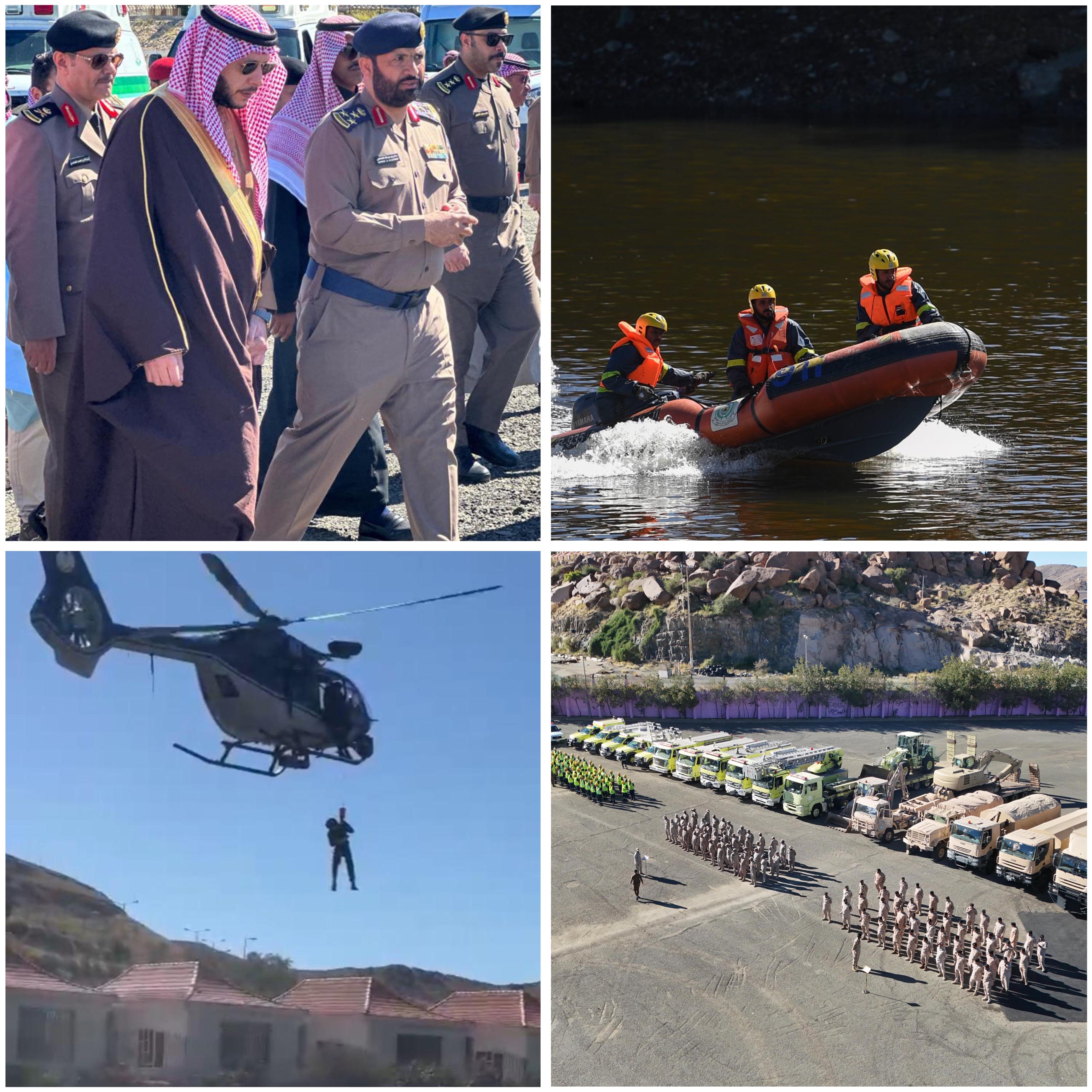 وقف صاحب السمو الملكي الأمير سعود بن نهار بن سعود بن عبدالعزيز محافظ الطائف اليوم الإثنين على فرضية الدفاع المدني والتي تهدف الى مواجهة مخاطر الأمطار والسيول للتأكد من جاهزية كافة الجهات الحكومية وذلك بحضور أعضاء لجنة الدفاع المدني الفرعيه حيث وقف سموه على منطقة الإسناد البشري والآلي بحي الخالدية ثم وقف ميدانياً على موقع الفرضية بسد جباجب بطريق الهدا وشاهد سموه تنفيذ عدد من المهارات المختلفة للإنقاذ في حوادث السيول والأمطار بواسطة الفرق الأرضية وبمشاركة طيران القوات الجوية وطيران الأمن .