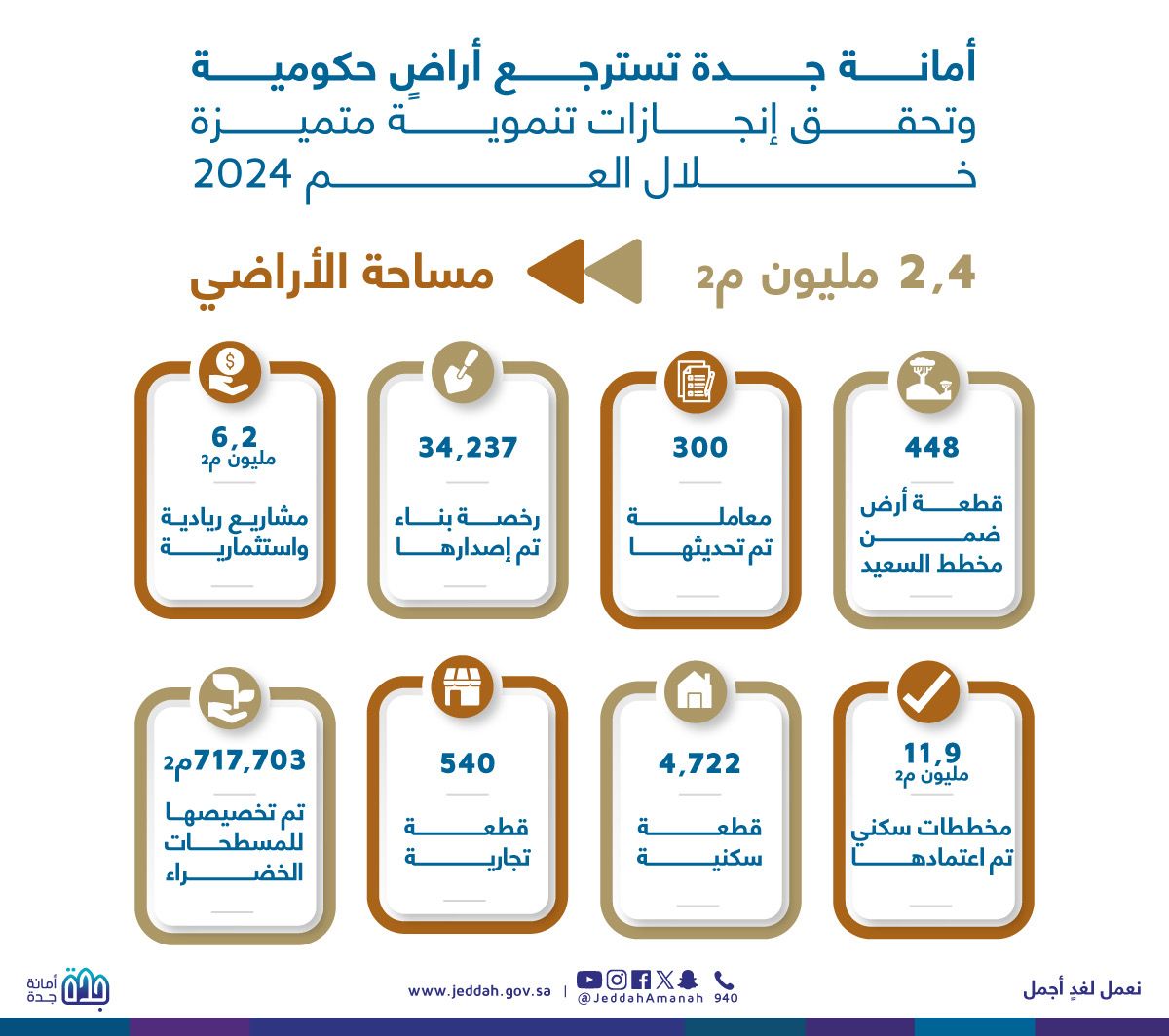 أعلنت أمانة محافظة جدة، في تقرير صادر عن وكالة التعمير، استرجاع أراضٍ حكومية بمساحة إجمالية بلغت 2,432,785.99 مترًا مربعًا خلال العام 2024، إلى جانب تحقيق سلسلة من الإنجازات النوعية في إدارة الأراضي والتنمية الحضرية.