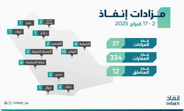 أعلن مركز الإسناد والتصفية “إنفاذ” إقامة 36 مزادًا علنيًا ما بين حضوري وإلكتروني؛ لتصفية وبيع 334 عقارًا سكنيًا وتجاريًا، إضافةً إلى مجموعة من المركبات، وذلك في 12 منطقة بالمملكة خلال الفترة من 2- 17 فبراير 2025م.