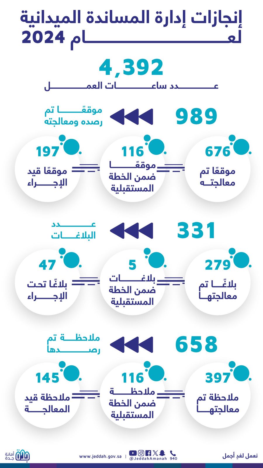 أسفرت جهود أمانة محافظة جدة في أعمال المساندة الميدانية خلال العام 2024 عن رصد ومعالجة 989 موقعا على مستوى أحياء المحافظة، ضمن البلاغات الواردة عبر حساب دعم عملاء الأمانة على منصة إكس، وجولات المراقبين الميدانيين، بإجمالي 4.392 ساعة عمل، يأتي ذلك في إطار الجهود المستمرة لتحسين المشهد الحضري وتعزيز جودة الحياة.