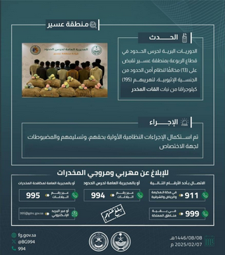 حرس الحدود بعسير يقبض على (13) مخالفًا لتهريبهم (195) كيلوجرامًا من القات المخدر