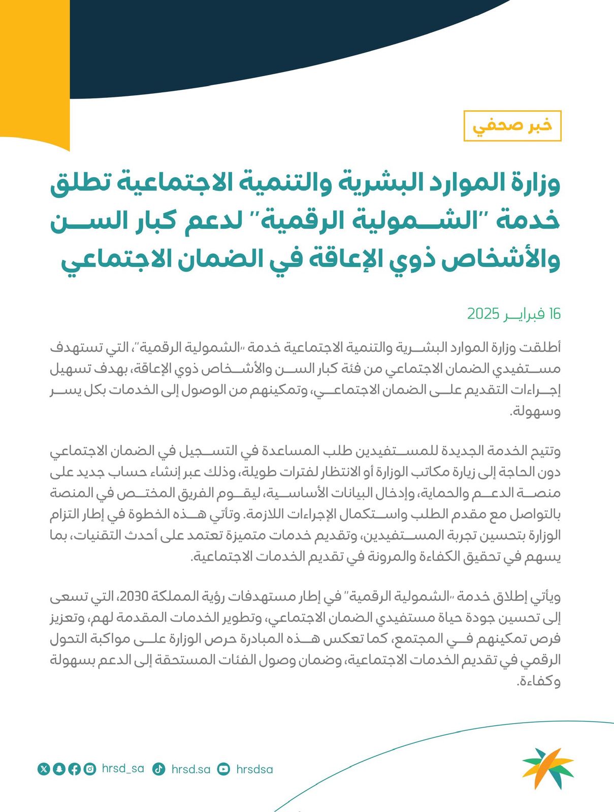 وزارة الموارد البشرية والتنمية الاجتماعية تطلق خدمة “الشمولية الرقمية”