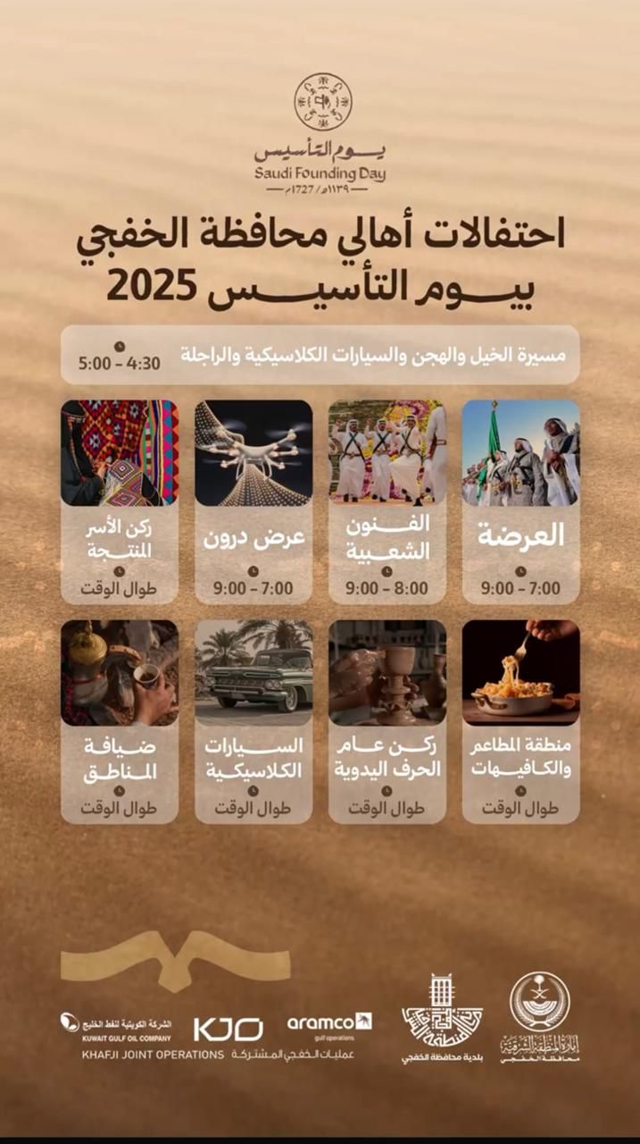 تحت رعاية محافظ الخفجي، محمد بن سلطان الهزاع، يحتفل أهالي الخفجي مساء اليوم السبت بذكرى يوم التأسيس 2025، وذلك بجوار المركز الحضاري بكورنيش الخفجي.
