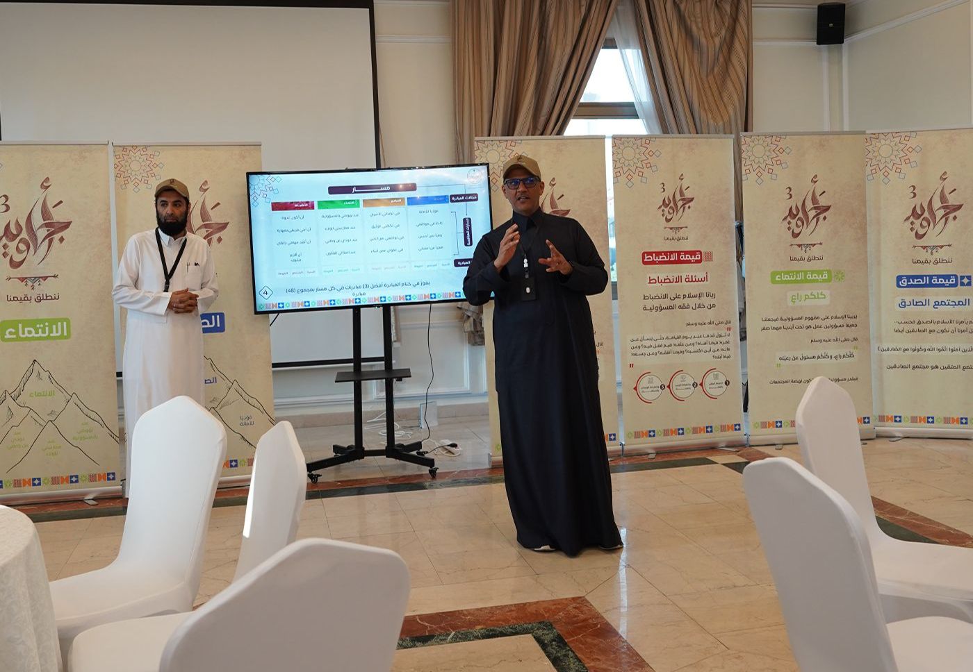 تم فيها شرح تفصيلي للمبادرة وتبادل الحضور الحديث حول بلورة الافكار لتتلاءم مع القيم الأربع وهي الصدق والانظباط والإنتماء و التسامح مسلطين على الرواسي المنبثقه منها ونتج عن هذه الورشه عصف ذهني مميز كان نتاجه عدد كبير من المبادرات القيمه والتي ستسهم في نشر القيم الإنسانية تماشيا مع خُلق نبينا محمد صلى الله علية وسلم .