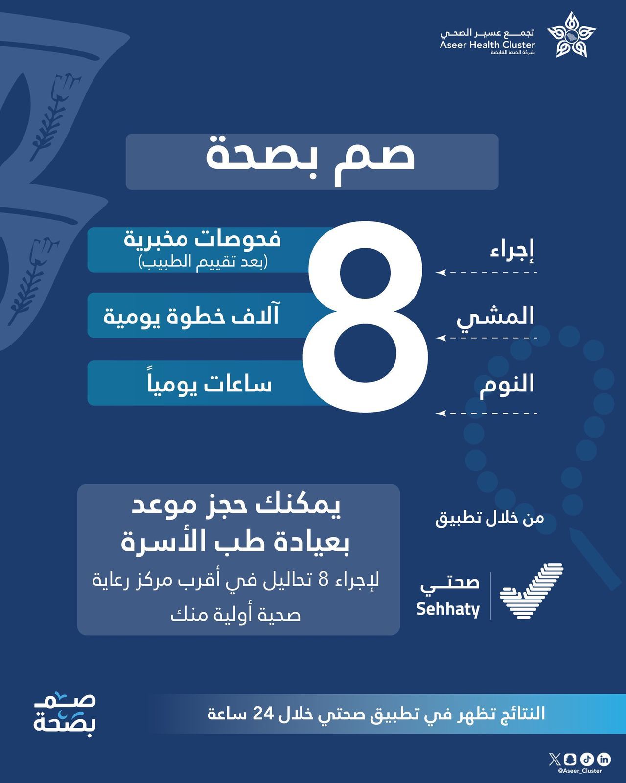 تجمع عسير الصحي يطلق حملة تحدي رمضان تماشياً مع الحملة الوطنية والتي أطلقتها الصحة القابضة تحدي رمضان ضمن حملة #صم_بصحة وذلك للمساعدة على تحقيق نمط صحي متوازن خلال شهر رمضان المبارك حيث تتمثل عناصر الحملة في إعادة التوازن الى حياة الجميع وتحسين الصحة الجسدية والنفسية وذلك للحفاظ على تحقيق نمط حياة صحي خلال الشهر الكريم وتتمثل الحملة في عدة ممارسات صحية منها :-