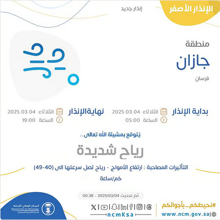 نبّه المركز الوطني للأرصاد اليوم من هبوب رياح شديدة على محافظة جزر فرسان بمنطقة جازان، تشمل تأثيراتها المصاحبة ارتفاعًا في الأمواج، حيث تصل سرعة الرياح إلى 40-49 كم/ساعة.