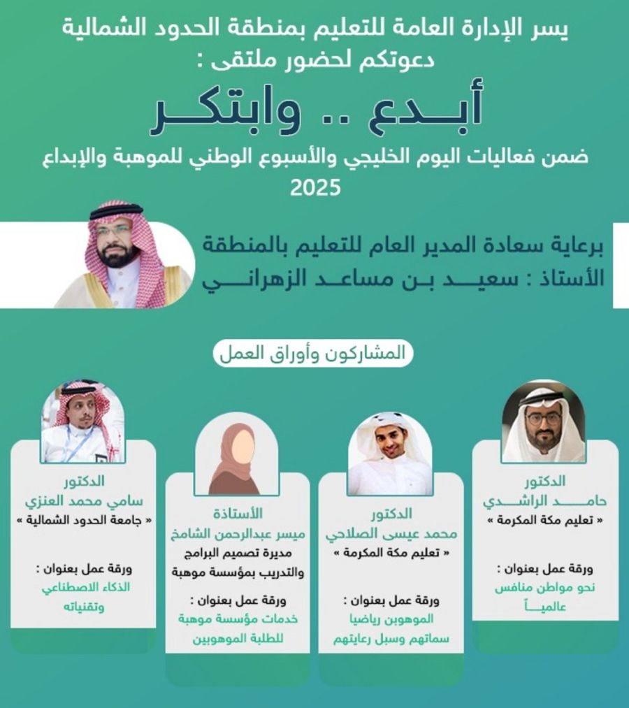 برعاية سعادة المدير العام للتعليم بمنطقة الحدود الشمالية الأستاذ سعيد بن مساعد الزهراني ، دشن ملتقى (أبدع و ابتكر) و الذي أقيم ضمن فعاليات الاحتفاء بـ اليوم الخليجي للموهبة والإبداع والذي قدم من خلاله المشاركون أوراق عمل متنوعة حيث استعرض الدكتور حامد الراشدي بتعليم مكة ورقته بعنوان "نحو مواطن منافس عالميا ً"، ثم قدم الدكتور محمد الصلاحي ورقة بعنوان "الموهوبين رياضياً سماتهم وسبل رعايتهم" ، بعد ذلك قدمت مديرة تصميم البرامج والتدريب بمؤسسة موهبة الأستاذة ميسر عبدالرحمن الشامخ ورقة بعنوان "خدمات مؤسسة موهبة للطلبة الموهوبين"، وقدم الدكتور سامي العنزي من جامعة الحدود الشمالية ورقة عمل بعنوان "الذكاء الاصطناعي وتقنياته".
