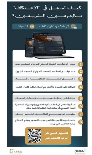 وأفادت أن خدمة إصدار تصريح الاعتكاف مخصّصة للأفراد الذين لا تقل أعمارهم عن 18 عامًا من المواطنين أو المقيمين في المملكة من يحملون إقامة نظامية سارية، حيث تقدّم التصاريح مجانًا بعد تقديم "طلب تسجيل اعتكاف" عبر الرابط المخصّص للخدمة: https://alharamain.gov.sa/public، والمتاح باللغات العربية والإنجليزية والأوردية.