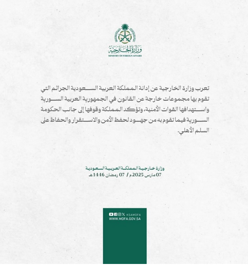 أعربت وزارة الخارجية عن إدانة المملكة العربية السعودية الجرائم التي تقوم بها مجموعات خارجة عن القانون في الجمهورية العربية السورية واستهدافها القوات الأمنية.وأكدت المملكة وقوفها إلى جانب الحكومة السورية فيما تقوم به من جهود لحفظ الأمن والاستقرار والحفاظ على السلم الأهلي.