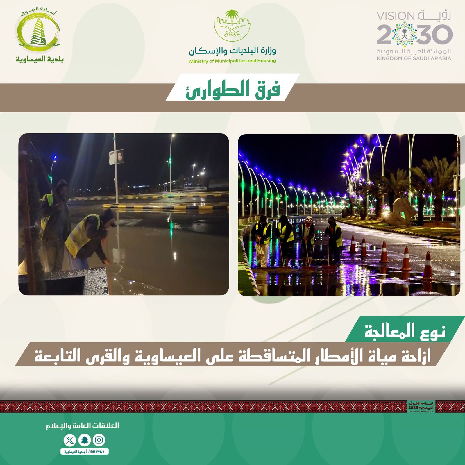 وأضاف أن فرقة من فنيي الكهرباء وفنيي ميكانيك المضخات تتابع عمل المضخات أثناء هطول الأمطار، مشيرًا إلى أنه في الأماكن غير المخدومة بشبكة تصريف ومع هطول الأمطار باشرت بلدية مركز العيساوية بكامل إمكاناتها بالعمل على سحب التجمعات من الشوارع تباعاً باستخدام وايتات شفط المياه أو المضخات بحيث لا تسبب الأمطار أي إعاقة لحركة المرور في المدينة.
