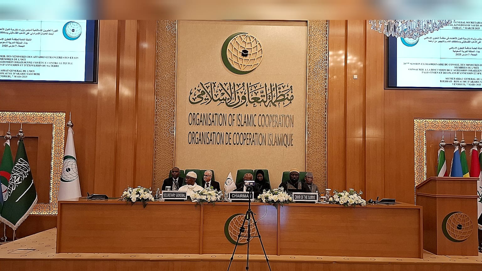 عقدت منظمة التعاون الإسلامي الدورة الاستثنائية لمجلس وزراء الخارجية في مقرها بجدة، اليوم الجمعة، 7 مارس 2025، وذلك لبحث العدوان الإسرائيلي المتواصل على الشعب الفلسطيني ومخططات الضم والتهجير من أرضه، وشهدت كلمات لمعالي الأمين العام لمنظمة التعاون الإسلامي السيد حسين إبراهيم طه ومعالي السيد لوجن مبيلا مبيلا، وزير العلاقات الخارجية بجمهورية الكاميرون، رئيس مجلس وزراء الخارجية، ومعالي الدكتور مامادو تنجارا، وزير الخارجية والتعاون الدولي والغامبيّين المغتربين، بجمهورية غامبيا التي ترأس القمة الإسلامية، ومعالي الدكتور محمد مصطفى، رئيس وزراء وزير الخارجية والمغتربين لدولة فلسطين كلمات في الجلسة الافتتاحية للاجتماع الوزاري الاستثنائي.