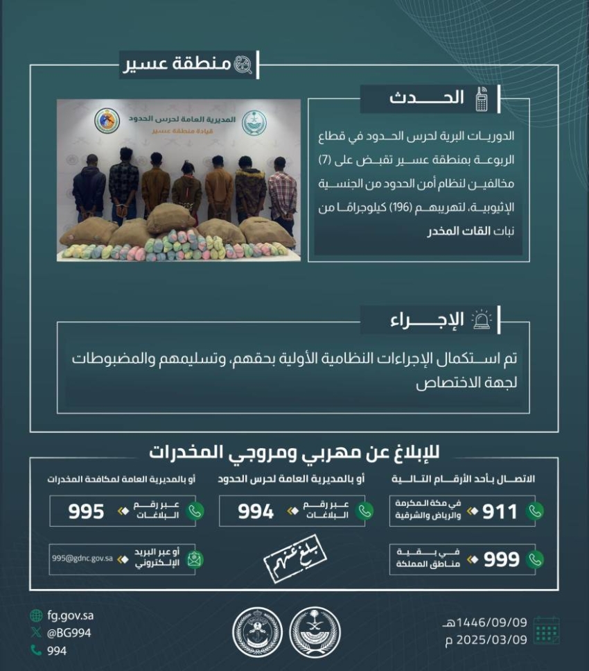 قبضت الدوريات البرية لحرس الحدود في قطاع الربوعة بمنطقة عسير على (7) مخالفين لنظام أمن الحدود من الجنسية الإثيوبية، لتهريبهم (196) كيلوجرامًا من نبات القات، وجرى استكمال الإجراءات النظامية الأولية بحقهم، وتسليمهم والمضبوطات لجهة الاختصاص.