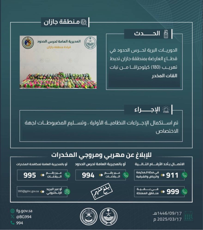 أحبطت الدوريات البرية لحرس الحدود في قطاع العارضة بمنطقة جازان تهريب (180) كيلوجرامًا من نبات القات المخدر، وجرى استكمال الإجراءات النظامية الأولية، وتسليم المضبوطات لجهة الاختصاص.