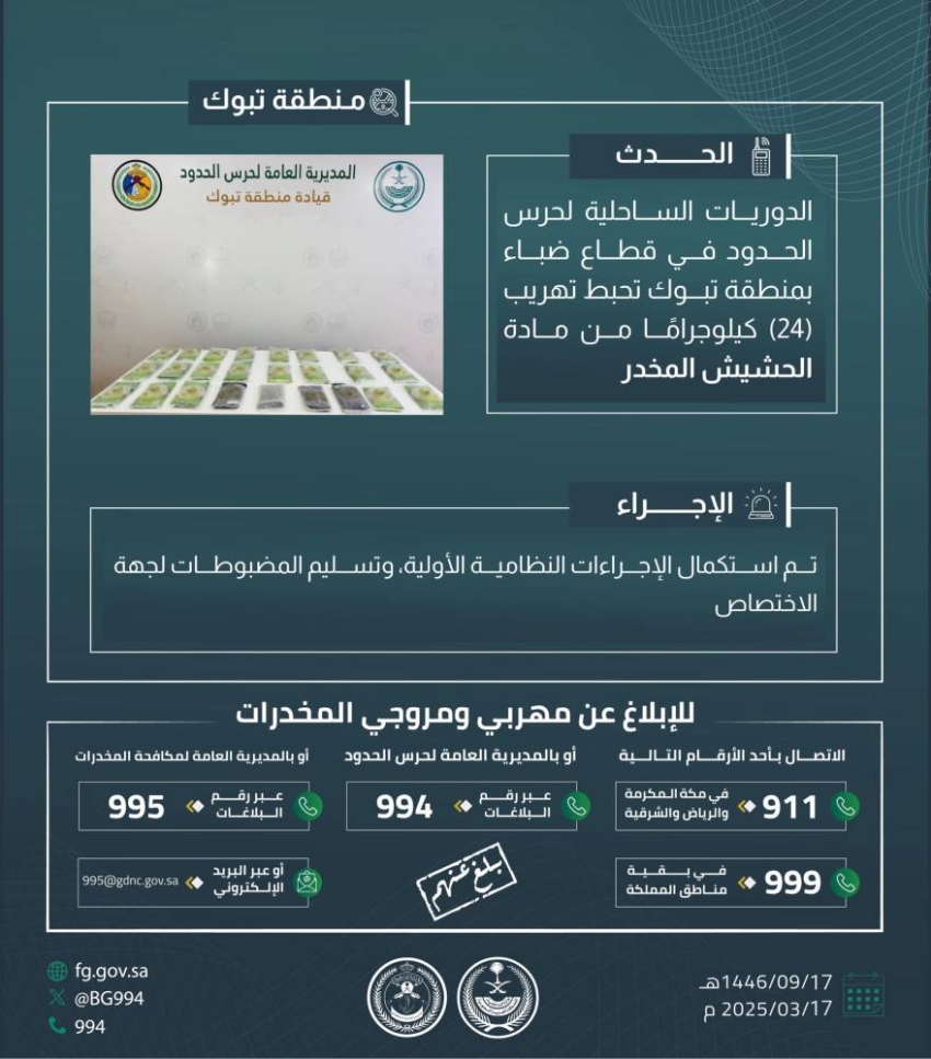 أحبطت الدوريات الساحلية لحرس الحدود في قطاع ضباء بمنطقة تبوك تهريب (24) كيلوجرامًا من مادة الحشيش المخدر، وجرى استكمال الإجراءات النظامية الأولية، وتسليم المضبوطات لجهة الاختصاص.
