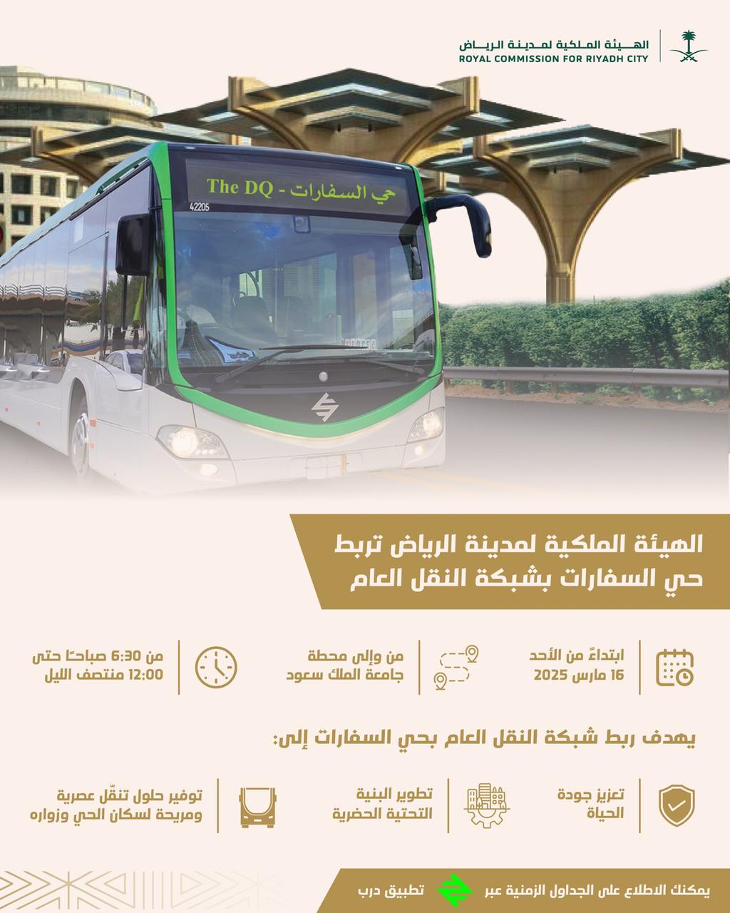 أطلق مترو الرياض أمس الأثنين، النقل الترددي بين محطة جامعة الملگ سعود وحي السفارات عبر حافلات الرياض بالمسار 939.