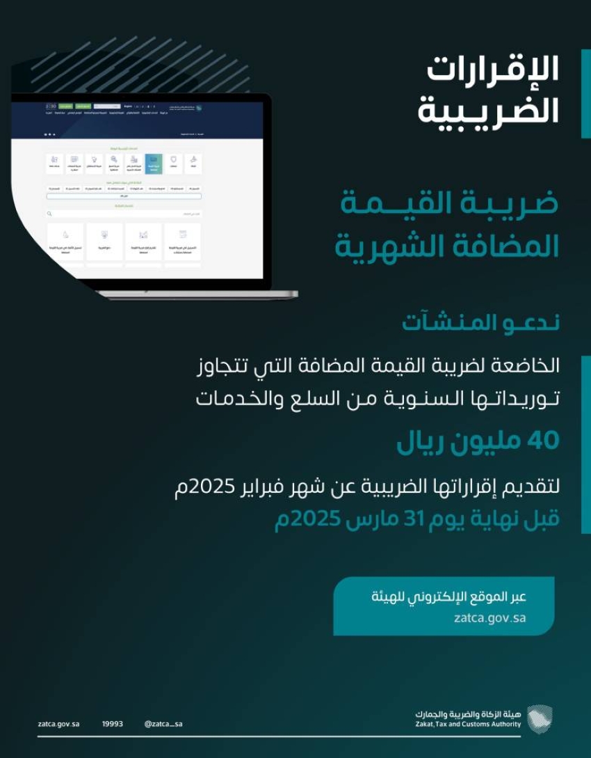 دعت هيئة "الزكاة والضريبة والجمارك" المنشآت من قطاع الأعمال الخاضعين لضريبة القيمة المضافة التي تتجاوز توريداتها السنوية من السلع والخدمات 40 مليون ريال إلى تقديم إقراراتها الضريبية عن شهر فبراير 2025م، في موعدٍ أقصاه 31 من شهر مارس 2025م.