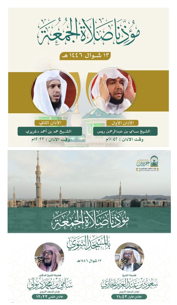 أعلنت رئاسة الشؤون الدينية بالمسجد الحرام والمسجد النبوي، أسماء المؤذنين لصلاة الجمعة القادمة الموافق 13 شوال 1446هـ، وذلك ضمن جهودها المستمرة في تنظيم أوقات الصلاة وإبلاغ قاصدي وزائري الحرمين الشريفين بمواعيد الأذان والمؤذنين المعنيين.