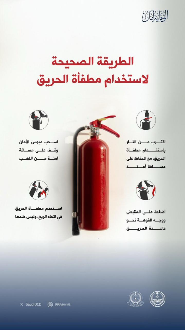 أوضحت المديرية العامة للدفاع المدني أهمية اقتناء طفايات الحريق داخل المنازل، وضرورة تعلم الطرق الصحيحة لاستخدامها عند وقوع حوادث الحريق لا قدر الله؛ حمايةً للإنسان ومحافظةً على الممتلكات.