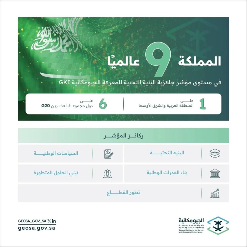 حققت المملكة ممثلة- بالهيئة العامة للمساحة والمعلومات الجيومكانية- مرتبةً متقدمة في مؤشر جاهزية البنية التحتية للمعرفة الجيومكانية (GKI) لعام 2025م، وتقدمت المملكة في التصنيف من (المرتبة 32) عام 2022م إلى (المرتبة 9) على مستوى دول العالم، (الأولى على منطقة الشرق الأوسط والعالم العربي، والسادسة على دول مجموعة العشرين "G20")، إذ جاء الإعلان عن ذلك خلال اليوم الأول من المنتدى الجيومكاني العالمي 2025 (Geospatial World Forum) المنعقد في العاصمة الأسبانية مدريد خلال الفترة من 22 إلى 25 أبريل الجاري.