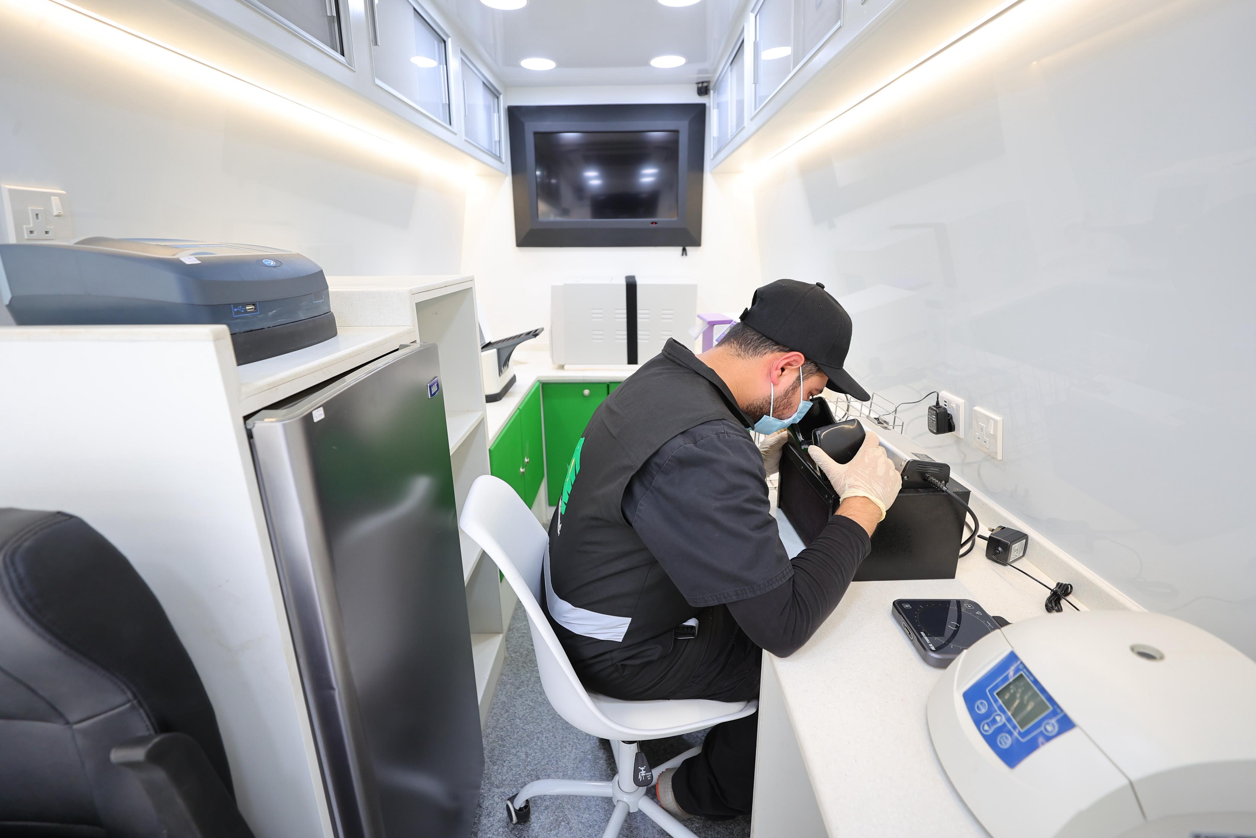 ويبلغ عدد المختبرات العاملة ( 5 ) مختبرات تشمل مختبرًا مركزيًا بالإضافة إلى مختبرات متنقلة في المواقع الحيوية، بطاقة تحليلية تصل إلى ( 1.300 ) عينة يوميًا، مما يسهم في تسريع فحص العينات واتخاذ الإجراءات الميدانية اللازمة.