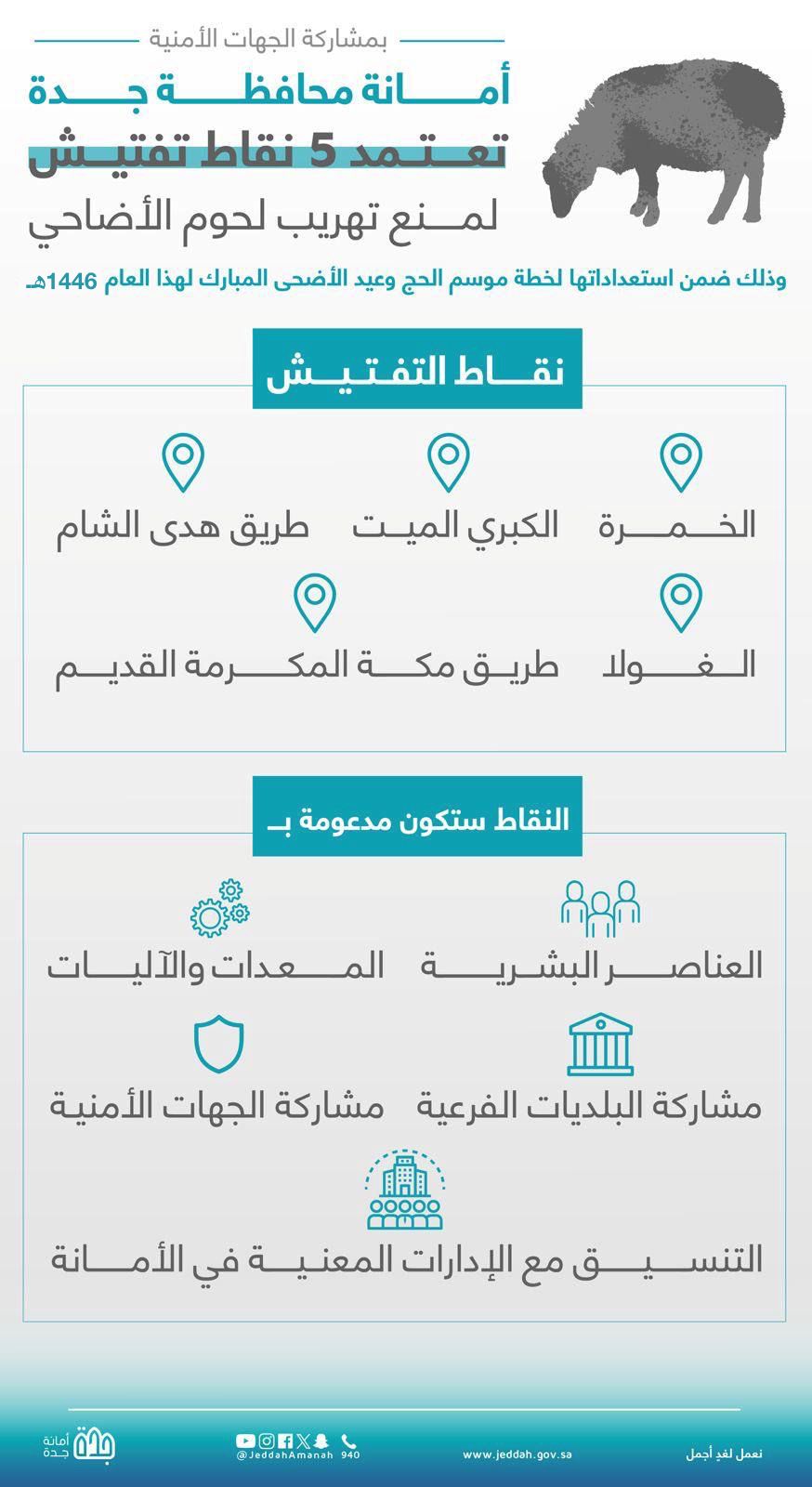 اعتمدت أمانة محافظة جدة 5 نقاط تفتش لمنع تهريب لحوم الأضاحي عبر منافذ ومداخل المحافظة بمشاركة الجهات الأمنية، وذلك ضمن استعداداتها لخطة موسم الحج وعيد الأضحى المبارك لهذا العام 1446.