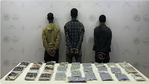 وفي قطاع ظهران الجنوب بمنطقة عسير، قبضت الدوريات البرية على ثلاثة مخالفين من الجنسية الإثيوبية أثناء محاولتهم تهريب 33 كيلوجرامًا من مادة الحشيش المخدر. وتم استكمال الإجراءات النظامية الأولية بحقهم، كما جرى تسليمهم والمضبوطات إلى جهة الاختصاص.