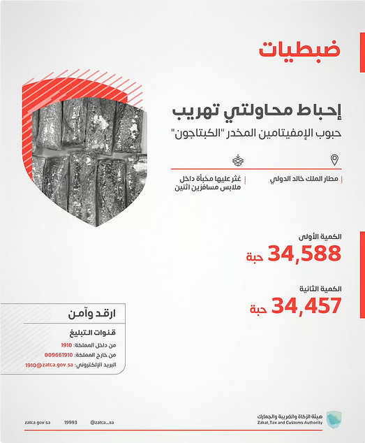 تمكّنت هيئة الزكاة والضريبة والجمارك "زاتكا" في مطار الملك خالد الدولي من إحباط محاولتي تهريب أكثر من 69 ألف حبة من مادة "الإمفيتامين" المخدر "الكبتاجون"، عُثر عليها مُخبأة داخل ملابس مسافرَين اثنين قدما إلى المملكة عبر المطار.