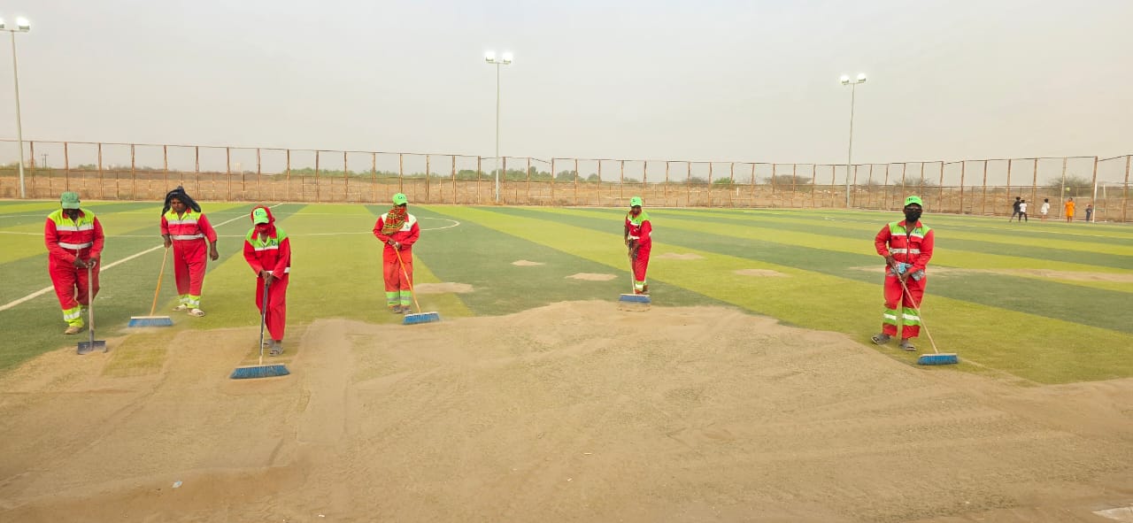 وتباشر فرق النظافة الميدانية أعمالها في 6 ملاعب بالقرى التابعة، شملت ملاعب: الباطنة، الكدمي، الملحاء، المحلة، أبو السلع، واللخباصية، إضافة إلى ملعبين رئيسيين في المدينة، وذلك عبر أعمال الكنس وإزالة الأتربة لضمان جاهزيتها.