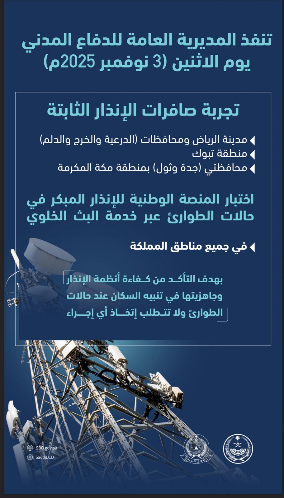تعتزم المديرية العامة للدفاع المدني إجراء تجربة المنصة الوطنية للإنذار المبكر على الهواتف المتنقلة في حالات الطوارئ بجميع مناطق المملكة، وصافرات الإنذار الثابتة في كل من (الرياض، وتبوك، وجدة) في تمام الساعة الواحدة مساء يوم الإثنين الموافق 1447/05/12هـ .