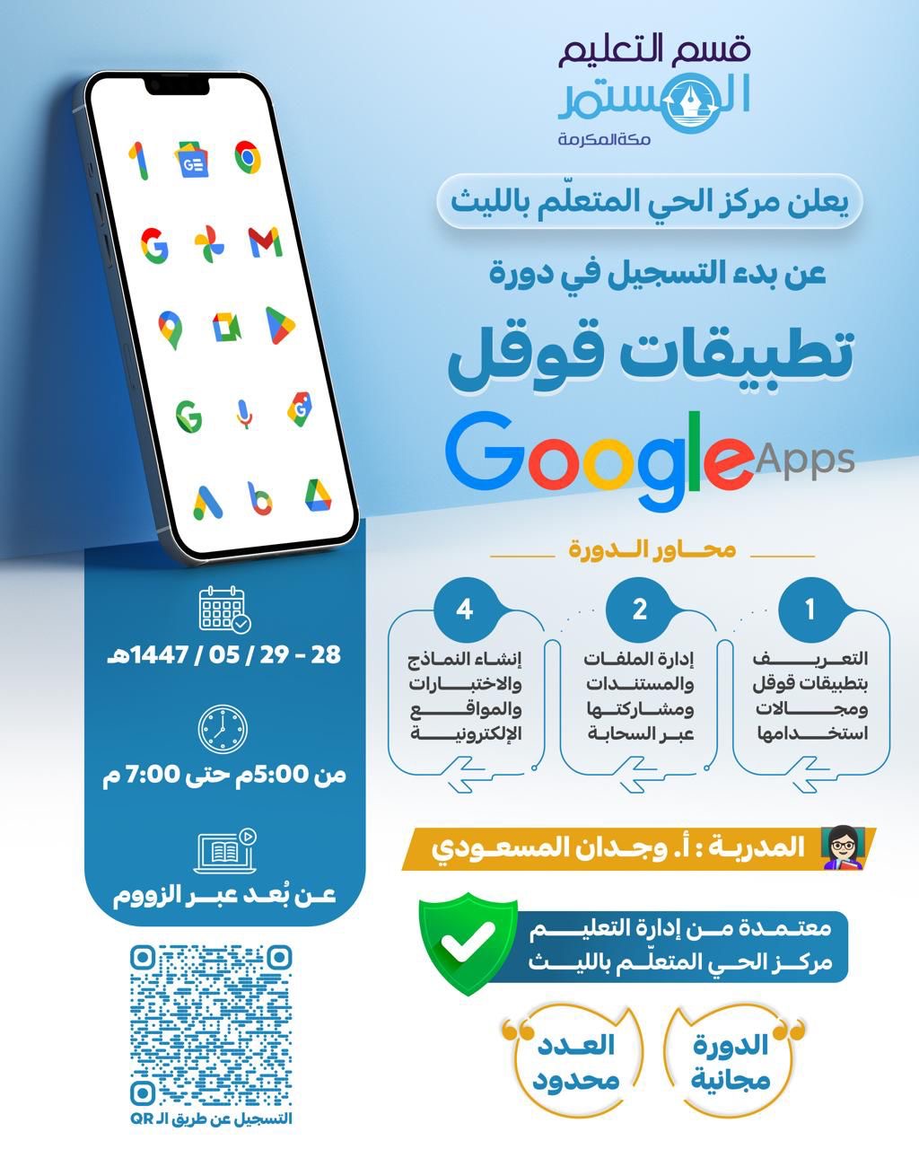 أقام قسم التعليم المستمر التابع للإدارة العامة للتعليم بمنطقة مكة المكرمة، بالتعاون مع مراكز الأحياء المتعلمة بمركز الحي المتعلم بالليث الدورة التدريبية بعنوان “تطبيقات قوقل” ضمن برامج مركز الحي المتعلم بالليث وذلك خلال يومي الأربعاء والخميس 28–29 / 05 / 1447هـ دورة تدريبية بعنوان “تطبيقات قوقل” قدمتها المدربة أ. وجدان مقبول المسعودي عن بعد عبر منصة زووم، تحت اشراف المشرف العام علي بن ناجم العرياني، بمشاركة عدد كبير من المتدربين والمتدربات من داخل محافظة الليث وخارجها، لرفع كفاءة المتدربات في استخدام تطبيقات قوقل في الأعمال المكتبية وإدارة الملفات بطريقة احترافية وفعّالة.