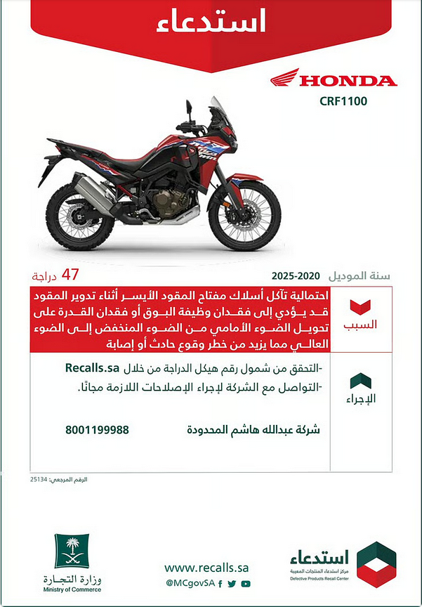 أعلنت وزارة التجارة عن استدعاء 47 دراجة نارية من طراز هوندا CRF1100، موديلات 2020 – 2025، وذلك لوجود خلل فني قد يؤثر على سلامة المستخدمين.