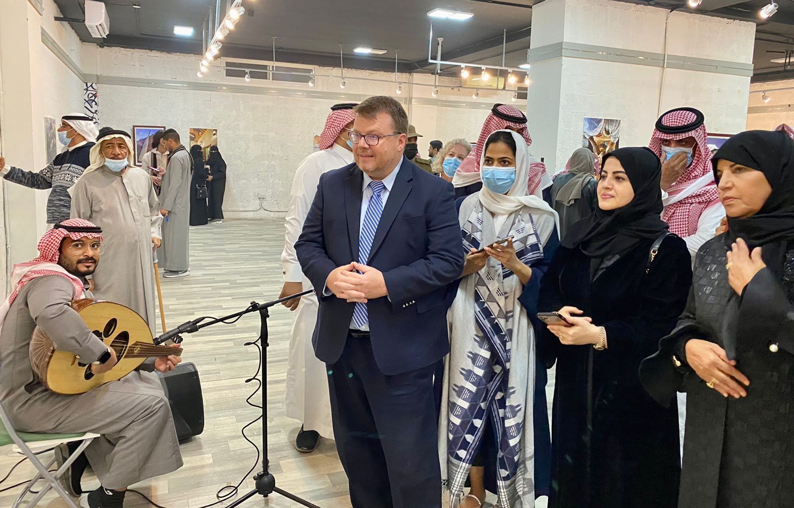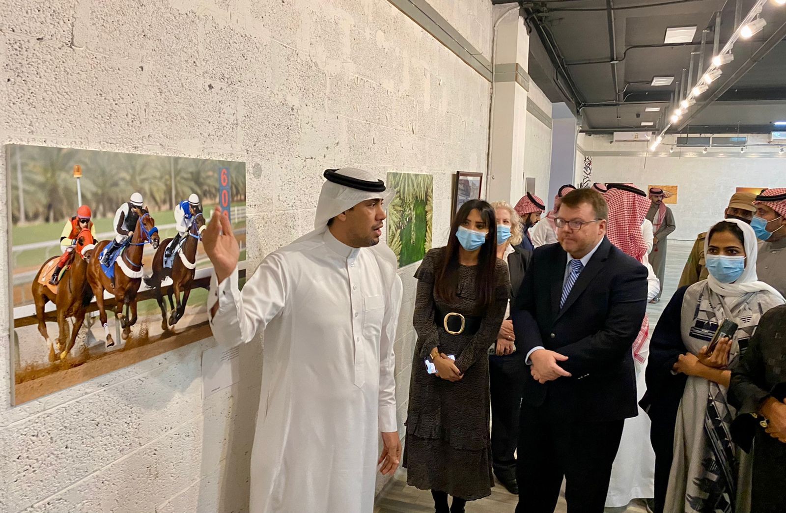 بعد ذلك توجه الوفد نحو صالة "محمد الصندل للفنون البصرية" واستمتعوا لشرح من قبل المصورين الفوتوغرافيين للوحاتهم التصويرية المعروضة، على وقع العزف المنفرد من قبل الفنان عبداللطيف البريكان.