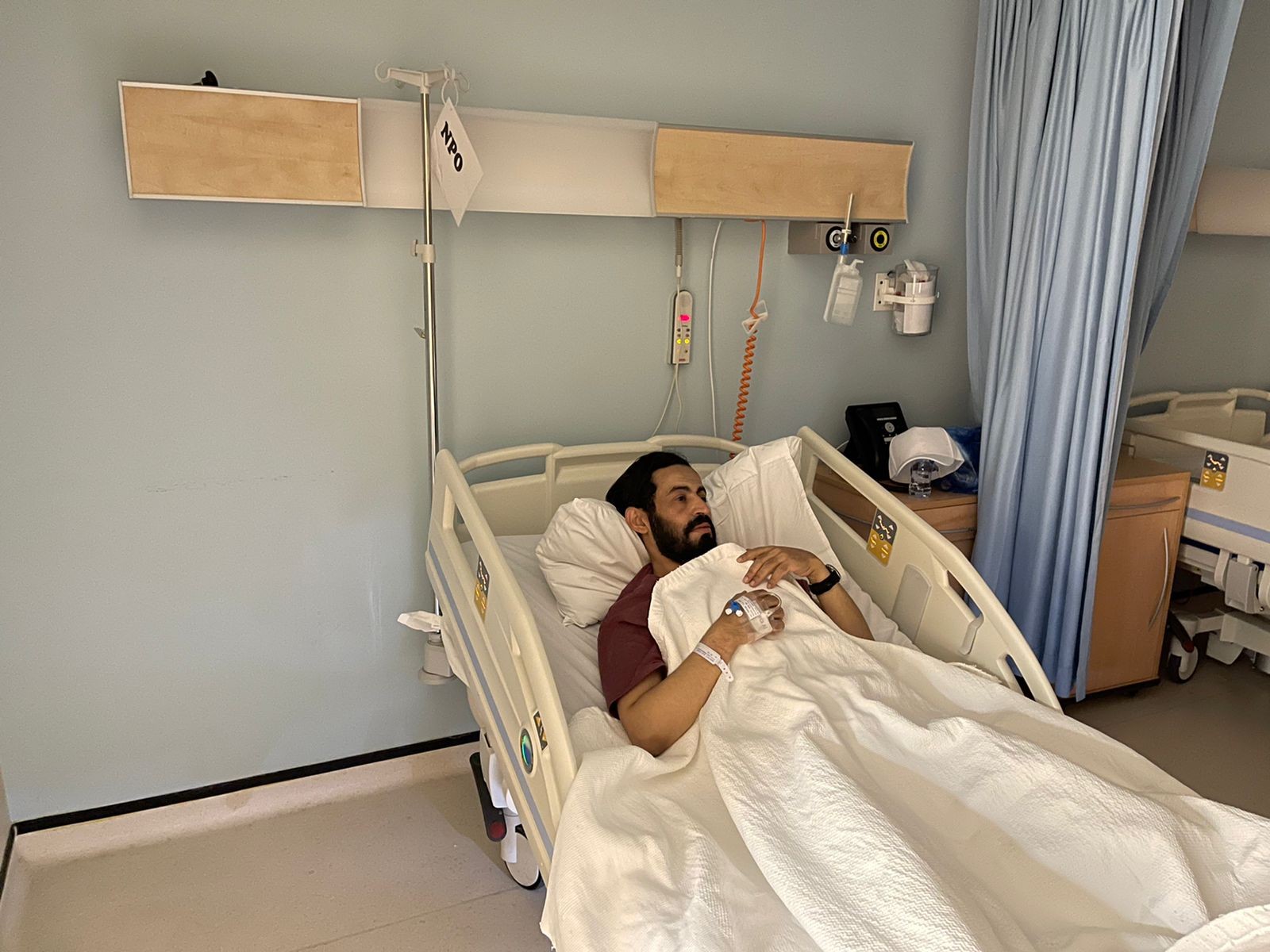 على السرير الأبيض في مستشفى الملك سلمان بن عبدالعزيز التخصصي بحائل ، بعد تعرضه لوعكة صحية مفاجئة ،