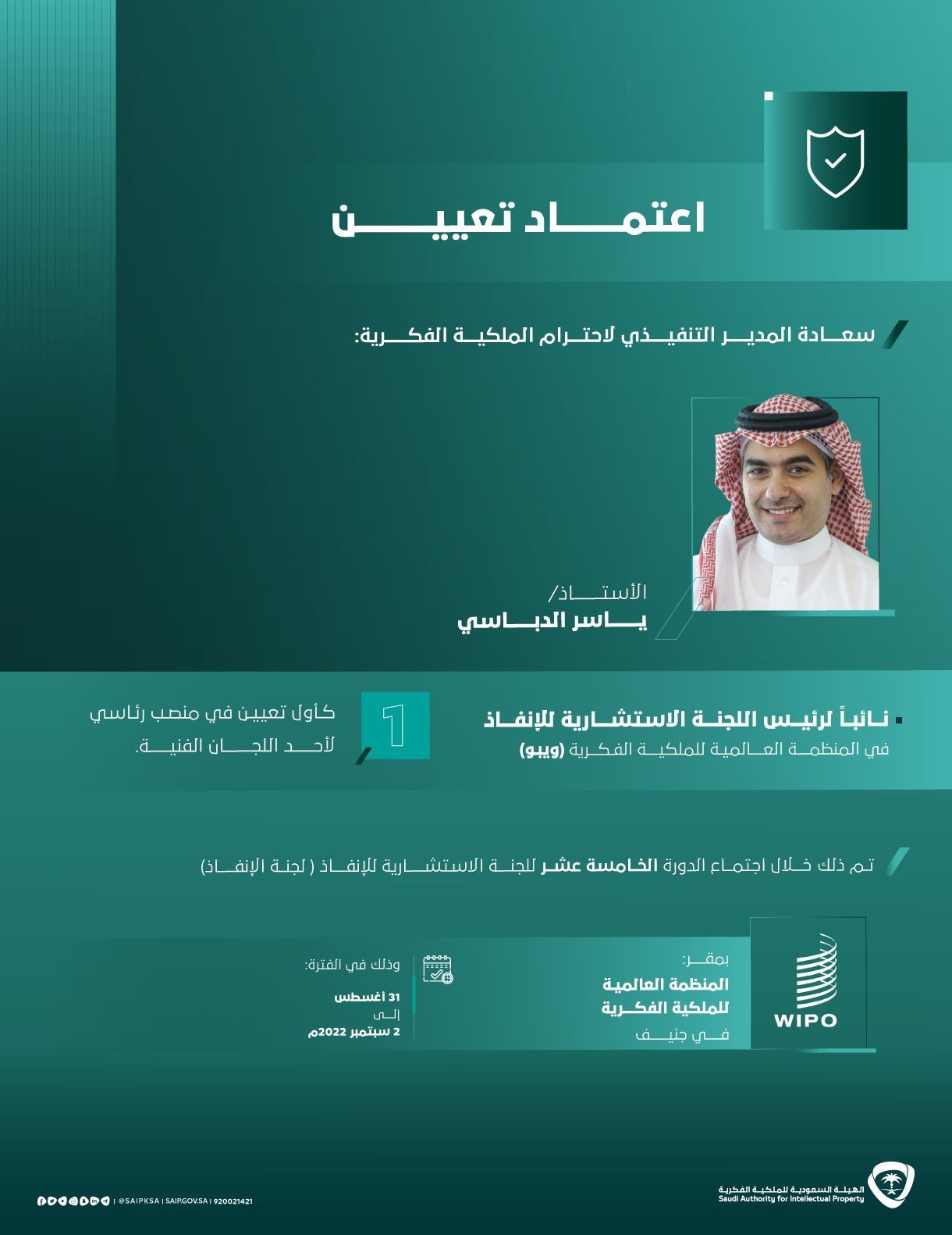 أعلنت الهيئة السعودية للملكية الفكرية عن اعتماد تعيين سعادة المدير التنفيذي لاحترام الملكية الفكرية الأستاذ ياسر بن صالح الدباسي نائباً لرئيس اللجنة الاستشارية للإنفاذ في المنظمة العالمية للملكية الفكرية (ويبو) كأول تعيين في منصب رئاسي لأحد اللجان الفنية، وتم ذلك خلال اجتماع الدورة الخامسة عشر للجنة الاستشارية للإنفاذ بمقر المنظمة العالمية للملكية الفكرية في جنيف.
