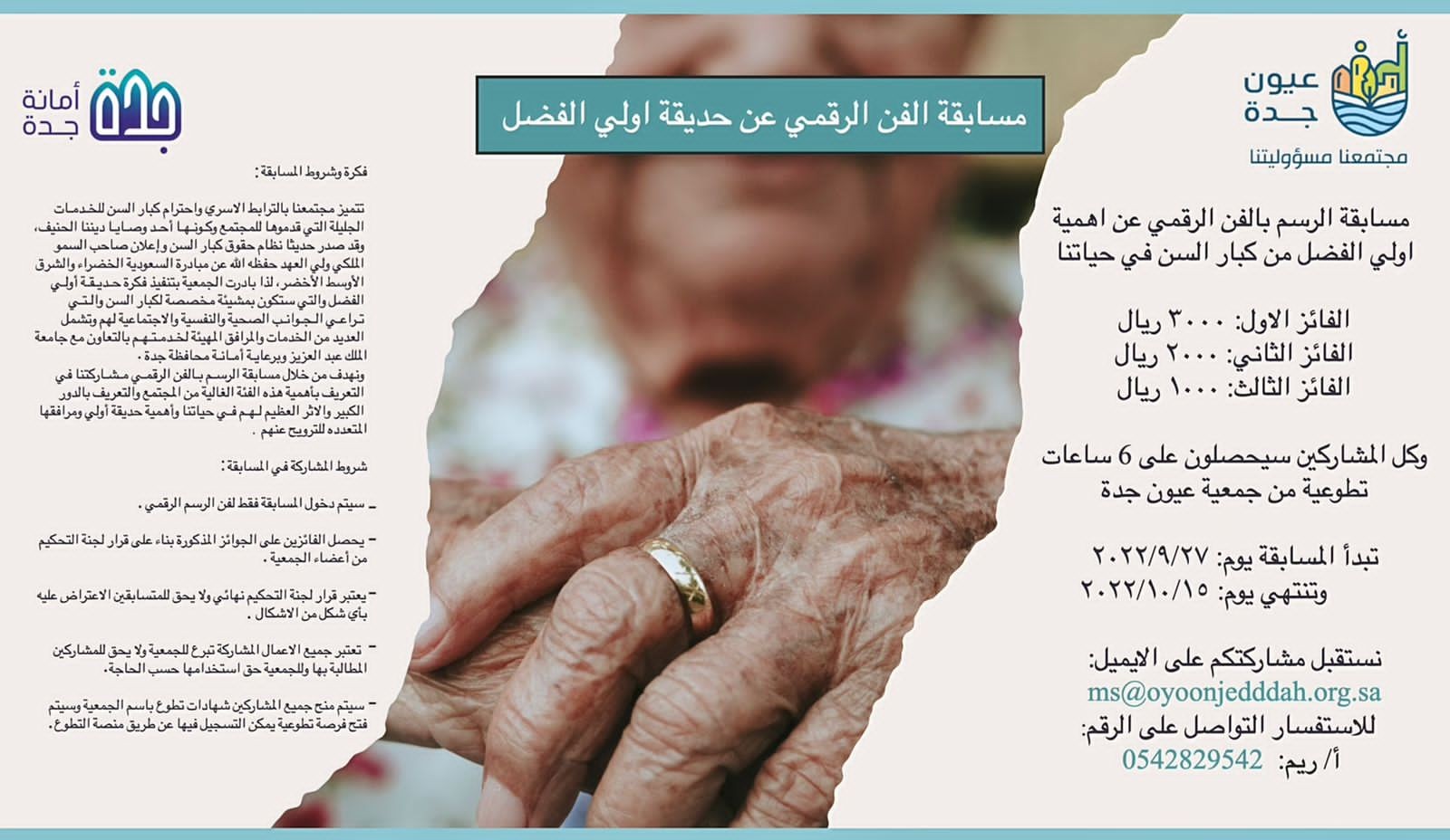 تزامنا مع اليوم العالمي لكبار السن  الذي يصادف الأول من أكتوبر من كل عام، وإيماناً بأهمية هذه الفئة الغالية في المجتمع وبرعاية كريمة من أمانة محافظة جدة أطلقت جمعية عيون جدة "مسابقة الرسم بالفن الرقمي" وهو أحد أهم الأهداف التي تسعى إلى تحقيقها الجمعية بالتعاون مع شركاء النجاح من الجهات الحكومية وشركات القطاع الخاص والداعمين من رجال الاعمال عن أهمية أولو الفضل من كبار السن في حياتنا ، وتنطلق فكرة المسابقة من تميز مجتمعنا بالترابط الاسري واحترام وتوقير كبار السن كـونـهـا أحـد وصـايـا ديننا الحنيف و للخـدمـات الجليلة التي قدموها للمجتمع وقد أصدر مجلس الوزراء نظام حقوق كبار السن وطرق رعايتهم و الاهتمام بهم بالتوازي مع إعلان صاحب السمو الملكي ولي العهد حفظه الله عن مبادرة السعودية الخضراء والشرق الأوسط الأخضر وفي إطار جودة الحياة التي تنشدها رؤية المملكة 2030.