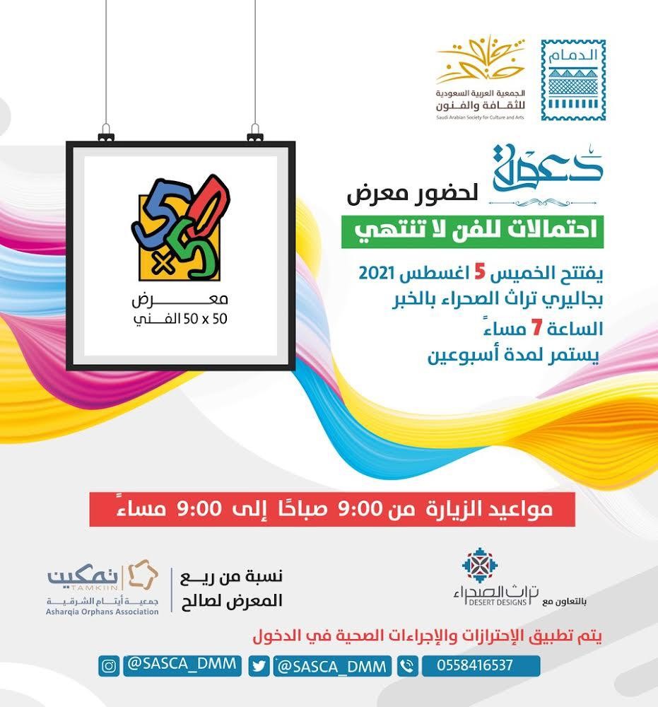 ويقدم الخطاط حسن آل رضوان مساء الثلاثاء ورشة أساسيات صناعة لوحة الخط العربي، ويفتتح مساء الخميس المقبل في جاليري تراث الصحراء في الخبر المعرض الفني (٥٠*٥٠) والذي يستمر اسبوعين ، وجزء من ريع المعرض لجمعية أيتام الشرقية "تميكن"، حيث يشارك بالمعرض أكثر من ١١٠ فنان وفنانة من مختلف مدن المملكة بأكثر من ٢٤٠ عملا فنيا.
