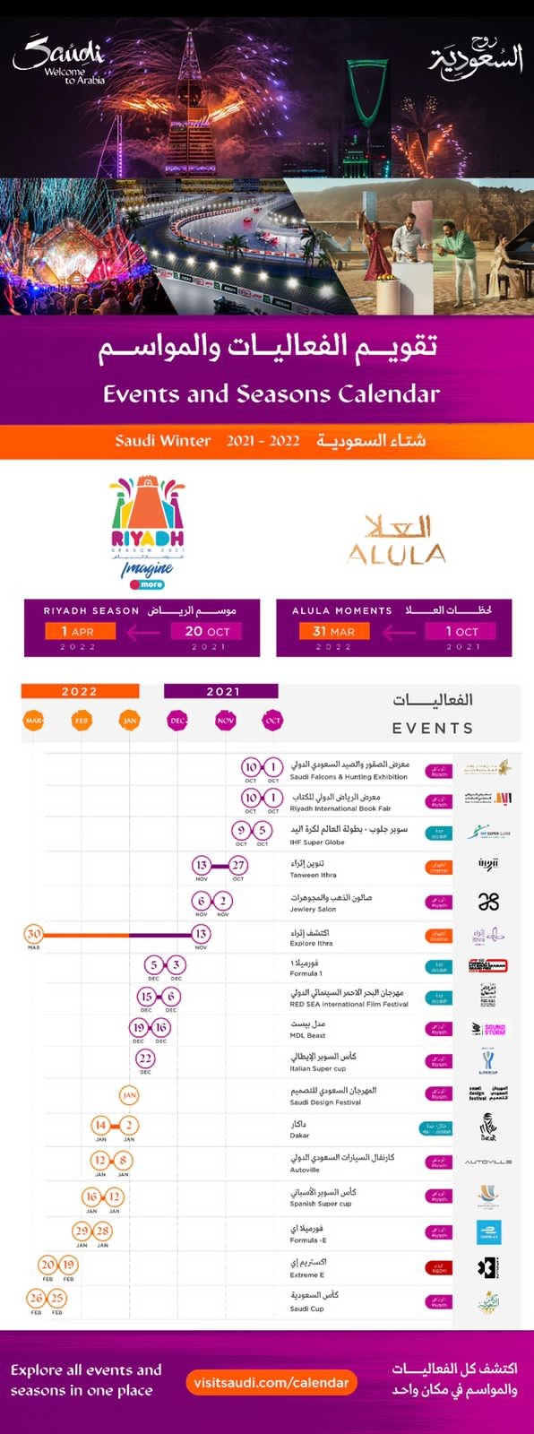ويأتي الاعلان عن تقويم الفعاليات والمواسم استكمالا لحملة "عن سنتين" والتي وعدت بعودة المواسم بحجم مضاعف وفعاليات أكبر حجما وأكثر تنوعاً، حيث تضمن التقويم فعاليات مضاعفة خلال الفترة الممتدة من أكتوبر 2021 الى مارس 2022 لتلبي كافة تطلعات العوائل والأفراد من مختلف شرائح المجتمع بهدف توفير تجربة سياحية استثنائية لزوار المملكة من الداخل والخارج، مع مراعاة الاشتراطات الصحية والتأكد من التزام الجميع بها بالتنسيق مع الجهات المختصة مما يضمن تجربة سياحيّة وترفيهيّة آمنة وسلسة.