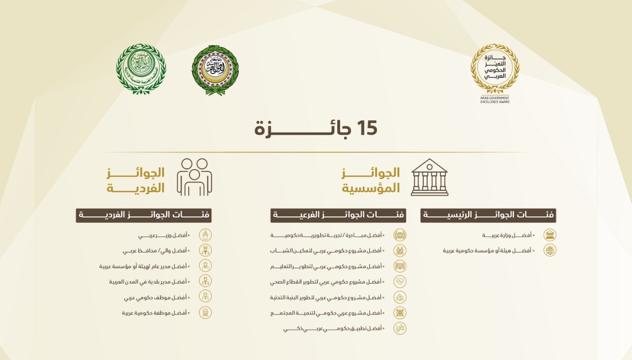 وتشارك في الدورة الثانية لجائزة التميز الحكومي العربي حكومات الدول العربية، وسيتم خلالها تكريم 15 فائزاً بفئات الجائزة المؤسسية والفردية، التي تضم أفضل وزارة عربية، وأفضل هيئة أو مؤسسة حكومية عربية، إلى جانب أفضل وزير عربي، أفضل والي/ محافظ عربي، وأفضل مدير عام عربي، وأفضل مدير بلدية في المدن العربية، وأفضل موظف وأفضل موظفة على المستوى العربي.