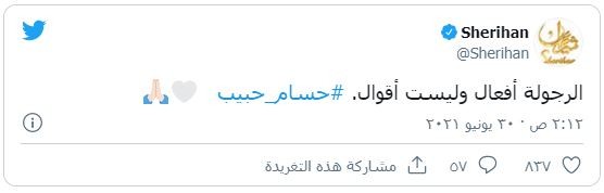 أثارت الفنانة المصرية شيرهان، الجدل حول معنى التعليق الذي كتبته، في قضية حسام حبيب، والتسريبات الصوتية المثيرة للجدل المنسوبة لوالده، حيث بدت تغريدتها على "توتير"،غامضة، وحمالة أوجه بين المدح او الذم. وقالت الفنانة شيريهان في تعليقها: «الرجولة أفعال وليست أقوال.. حسام حبيب».
